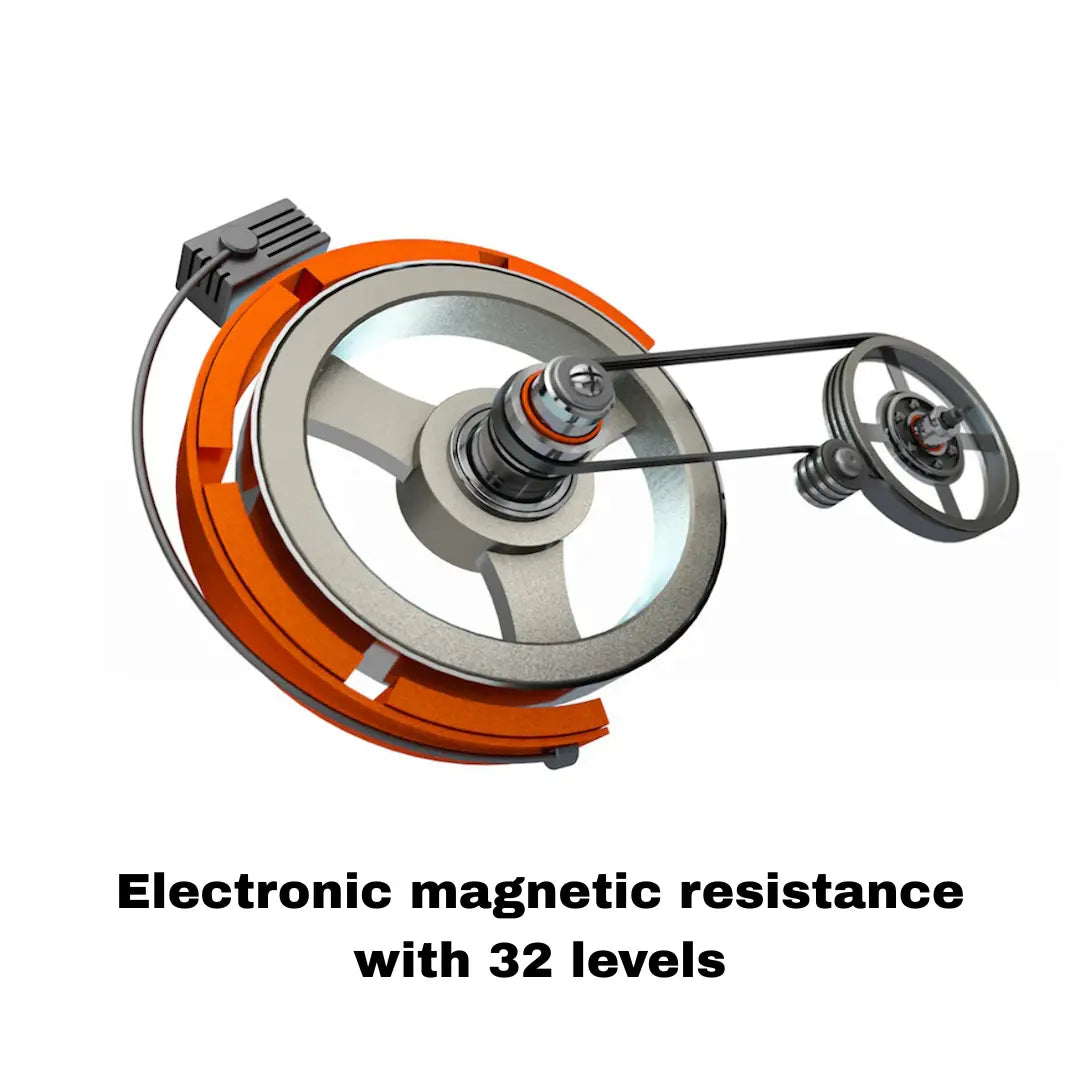 Motorised magnetic braking system designed for quiet operation with belt drive transmission.