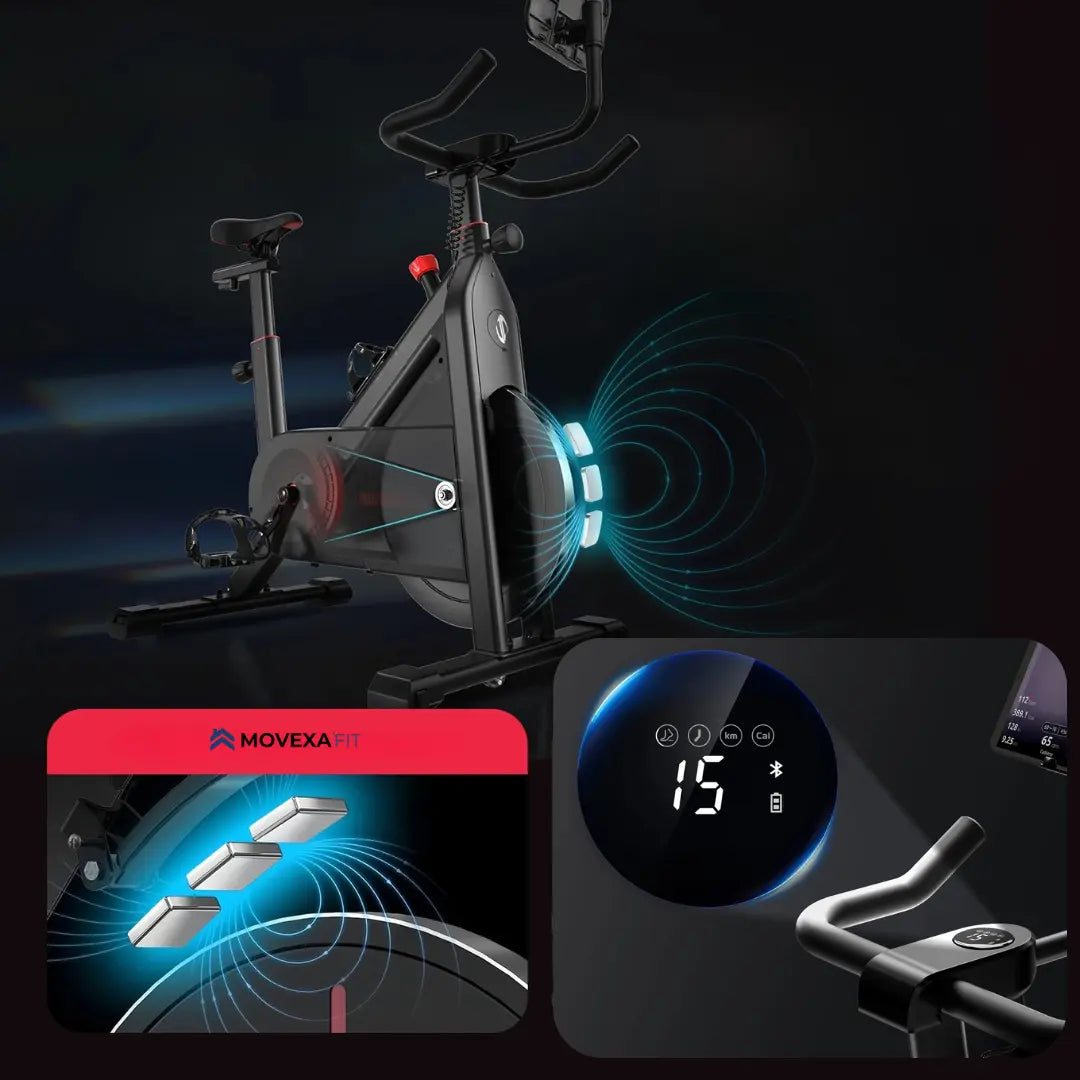 Le Movexa Fit Plus est un vélo d’appartement équipé d’un système de freinage magnétique motorisé, offrant une utilisation régulière et silencieuse.